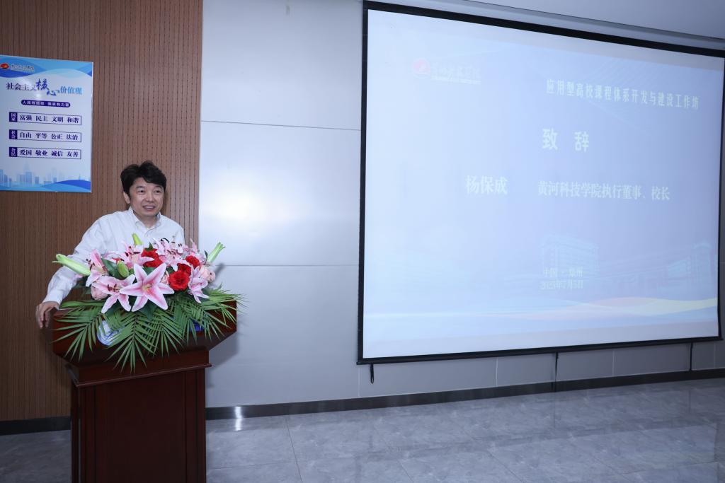 杨保成致欢迎辞,首先对参加工作坊的领导、专家和教师们表示热烈欢迎。他指出,应用型高校要以专业建设为引领、教学管理为支撑、课程建设为基础,构建产教深度融合的高质量发展体系。他期待以本次工作坊为契机,与各高校同仁深化合作,在学科建设、人才培养、师资发展等领域协同创新,共同为教育强国建设贡献实践智慧与改革方案。
