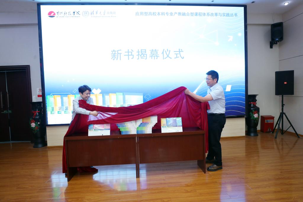 红绸轻启,封面绽放,镜头定格。在现场热烈的掌声中,丛书总主编杨保成教授与清华大学出版社分社白立军社长共同为新书揭幕!《应用型高校本科专业产教融合型课程体系改革实践》系列丛书正式走进公众视野。