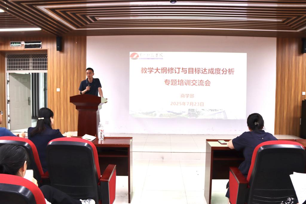为深入贯彻本科教育教学审核评估评建整改要求,有效指导教师基于OBE教育理念高质量完成新版课程教学大纲修订及课程目标达成度分析工作,商学部于7月23日下午组织召开了专题培训会。分党委书记郑月、执行部长张景忠等部领导和全体任课教师参加会议。本次培训采取“专题培训+自由交流”相结合的形式,会议由副部长孙常辉主持。