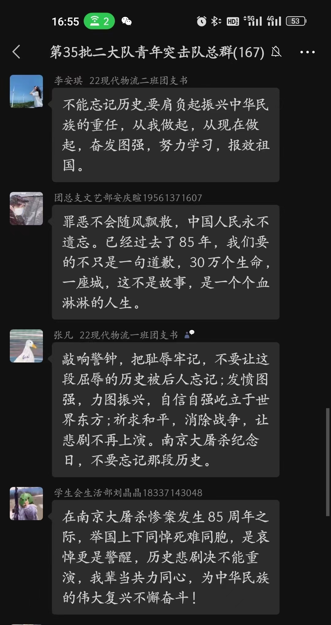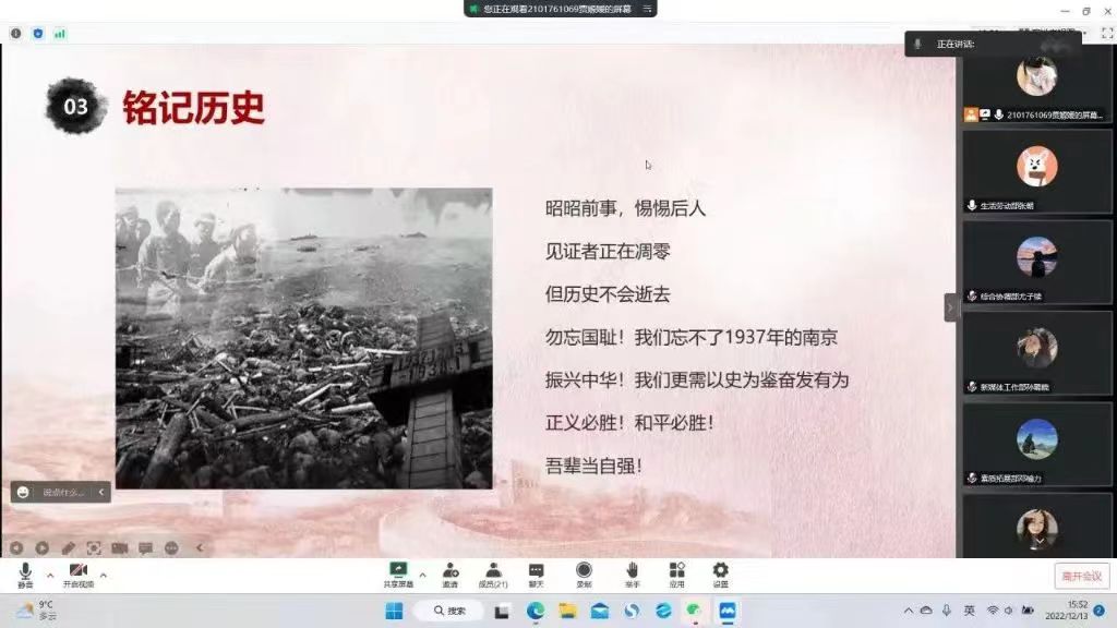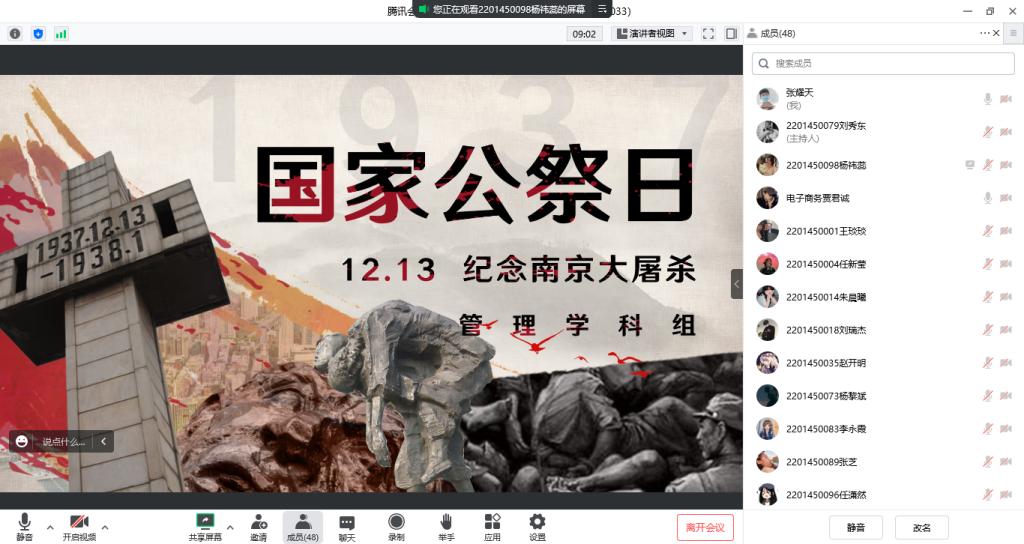 为培育学生爱国主义情怀,商学院组织各学科组青年突击队员在国家公祭日进行线上默哀活动,表达对南京大屠杀遇难同胞的沉痛哀思。党政办副主任张琳娜首先组织全体同学为遇难同胞默哀致敬,共同缅怀遇难同胞,铭记中华民族的苦难岁月。她向大家讲述了南京大屠杀的历史事件,讲解了设立国家公祭日的目的和意义等历史知识,叮嘱学生们牢记侵略战争给中国人民和世界人民造成的深重灾难,坚定维护世界和平的立场。