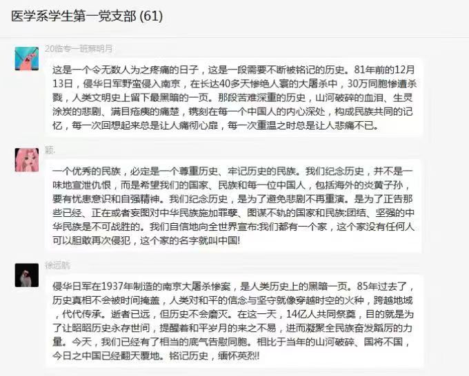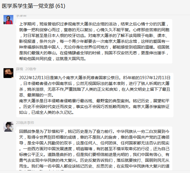 医学院举办“南京大屠杀死难者国家公祭日”主题教育。有关负责老师表示,此次活动最重要的是要让学生们不要忘记耻辱、忘记历史,“光明每前进一分,黑暗便后退一分”。中国人只有发光发热,砥砺前行,努力振奋中华,民族复兴,才能守护那些“不能忘却的记忆”。