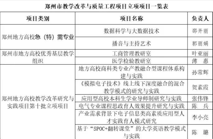 近日,郑州市教育局办公室公布了《关于郑州地方高校急(特)需专业 2019 年度立项建设期满验收和 2022 年度立项评审结果的通知》《关于郑州地方高校优秀基层教学组织2020 年度结项和 2022 年度立项评审结果的通知》《关于公布郑州地方高校教学改革研究与实践项目第九批结项和第十批立项评审结果的通知》等文件,beat3657项教学改革与质量工程项目全部通过验收结项,新获批郑州市教学改革与质量工程项目10项,其中教改项目6项、急(特)需专业2个、优秀基层教学组织2个。