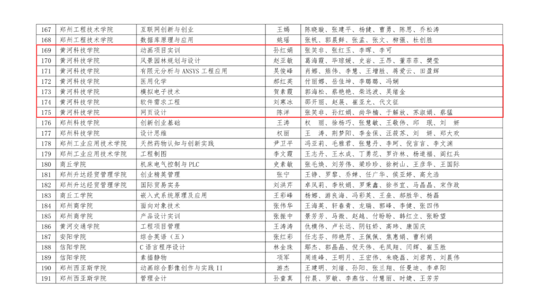 近日,河南省教育厅公布首批202门省级“专创融合”特色示范课程建设项目,学校“动画项目实训”(负责人孙红娟)、“风景园林规划与设计”(负责人赵亚敏)、“有限元分析与ANSYS工程应用”(负责人吴俊峰)、“医用化学”(负责人郝红英)、“模拟电子技术”(负责人贺素霞)、“软件需求工程”(负责人刘寒冻)、“网页设计”(负责人陈洋)等7门课程获批立项。