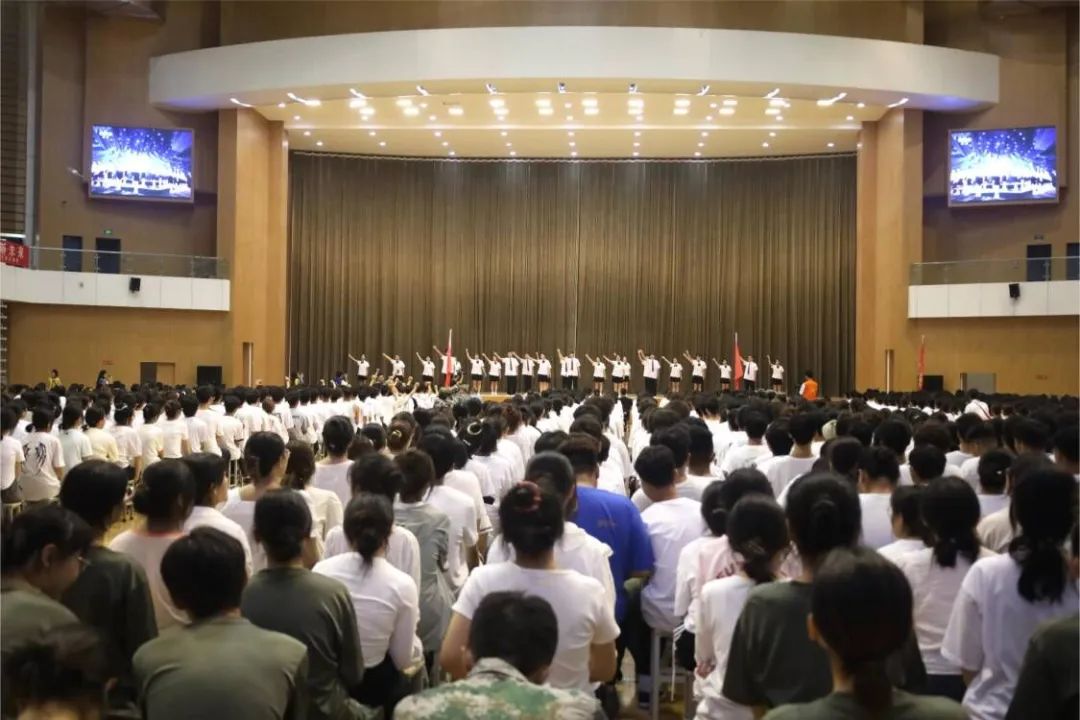 艺体学部2023级新生军训动员大会暨开学典礼在全体高唱《没有共产党就没有新中国》中圆满结束,激昂的歌声在会场回荡。