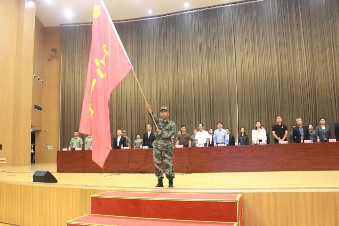 第一军训团副政委朱传新宣布军训团建制,罗煜授团旗。庄严的旗帜在会场挥舞,一时间,“听党指挥,勇打胜仗,初心一团,勇往直前”的口号声在体育馆中回荡,铿锵且有力。