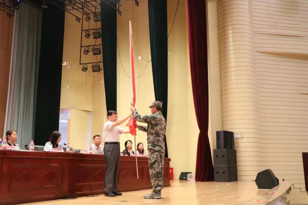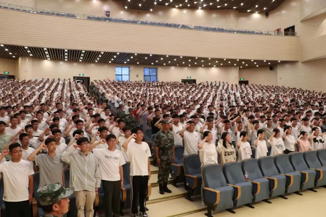 伴随着气宇轩昂的《强军战歌》,喻新安向商学部雷霆三团团长冉俊伟授旗,1400余名本专科新生起立宣誓,雷霆般的誓言在现场回荡,学员们表示将听从指挥,严守纪律;保持昂扬斗志,勇敢面对挑战,争做最出彩的科大人。