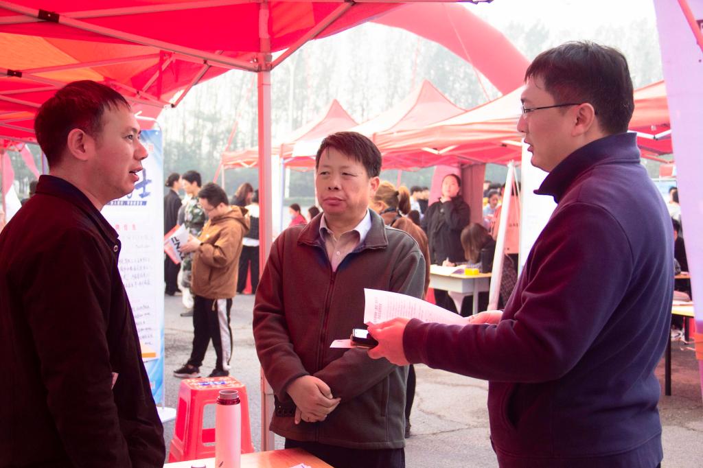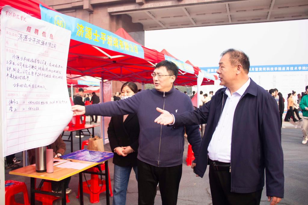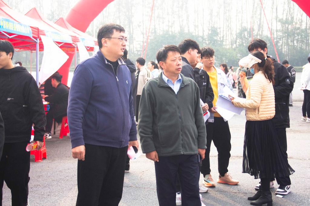 beat365官网学生中心主任、应用技术学院分党委书记张丕万,济源示范区人社局职介中心负责人赵晓、人力资源市场科科长姚继兴,应用技术学院院长徐斌等领导来到招聘会现场现场,与用人单位深入交流,了解招聘岗位需求、发展空间、薪资待遇等问题。