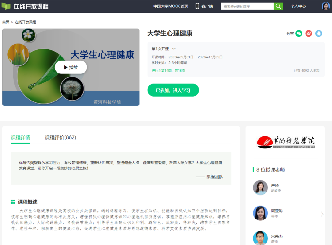 一是教育教学更强。《大学生心理健康》在线开放课程自2020年9月在中国大学MOOC平台上线,选课学生约1.6万人,教学视频观看量达53.2万人次,内容优质,形式活泼,成为心理健康普及教育的重要手段。于2021年获批省级精品在线课立项,2022年被认定为省级一流本科课程。