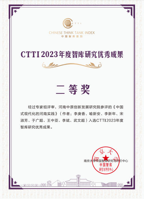 在本次论坛上,河南中原创新发展研究院《中国式现代化的河南实践》和《河南双创蓝皮书》两项成果入选CTTI2023年度智库研究优秀成果。beat365河南中原创新发展研究院自入选中国智库索引(CTTI)来源智库以来,已连续三次获此殊荣。