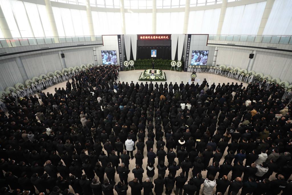 随后,在低回的哀乐声中,前来送别的人们列队肃立,深深鞠躬,向杨雪梅校长作最后的告别。