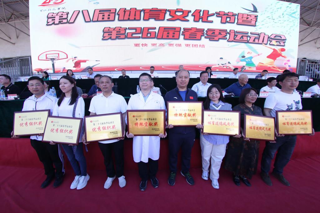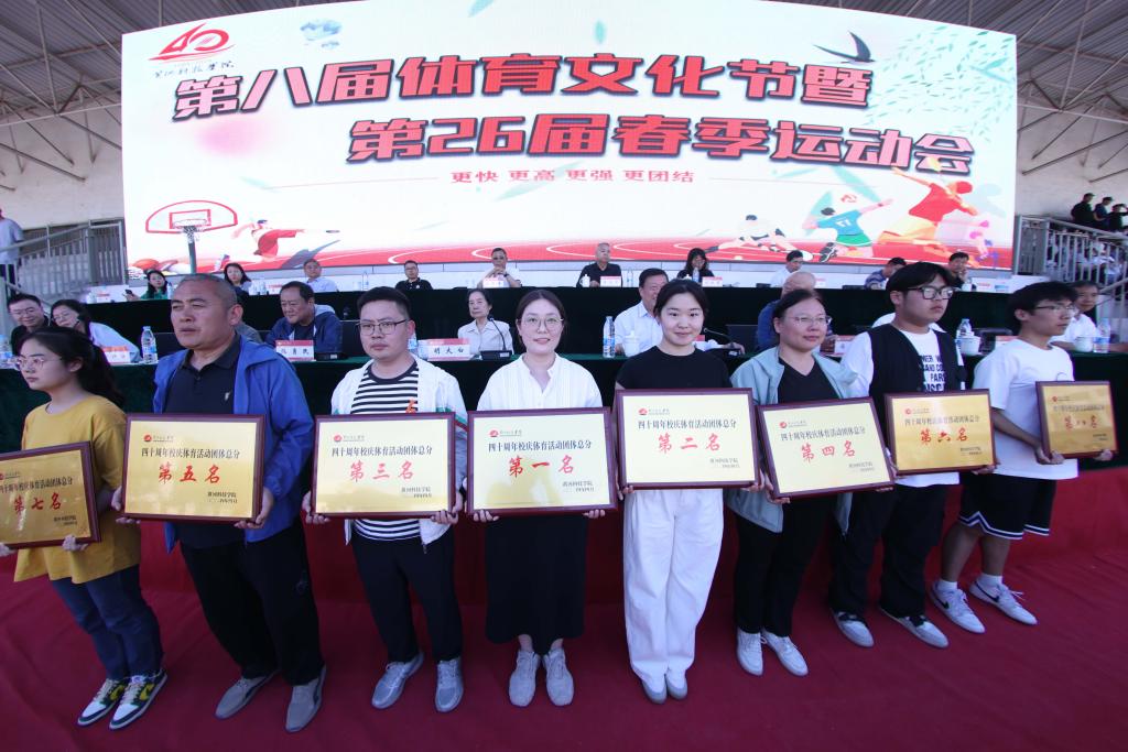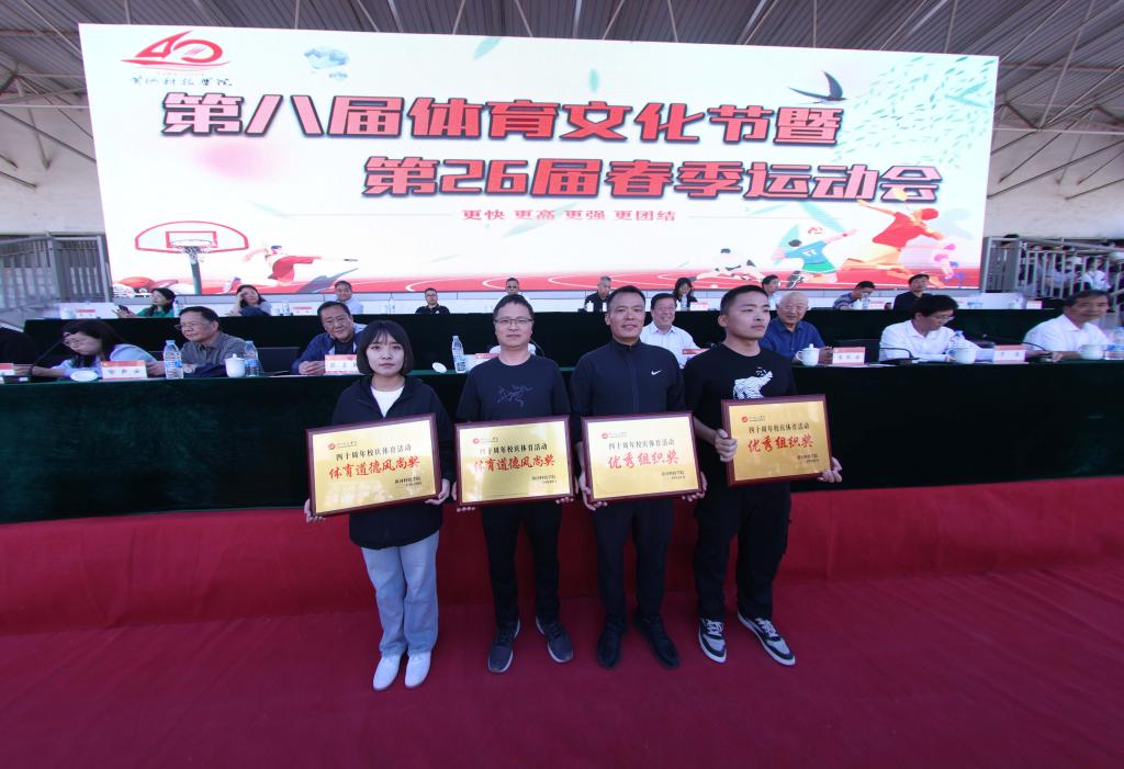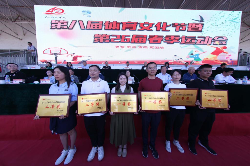 大会通报了各类竞赛成绩,对获奖单位和个人进行了表彰。艺体学部、商学部获得学生团体操表演一等奖;艺体学部2022级视觉传达设计专业朱景杨同学获得运动会会徽设计优胜奖;艺体学部、医学部获得教工团体比赛奖项第一名;电子材料科教中心、机电交通科教中心、大数据与计算机应用科教中心获得优秀组织奖;经济与管理科教中心、外语科教中心、医学部一队获得体育道德风尚奖;艺体学部、附属医院获得特殊贡献奖;电子材料科教中心获得甲组学生比赛第一名、2023级运动训练专业获得学生体育专业组第一名。大会还对庆祝40周年校庆体育竞赛活动团体总分前八名的集体进行了表彰。