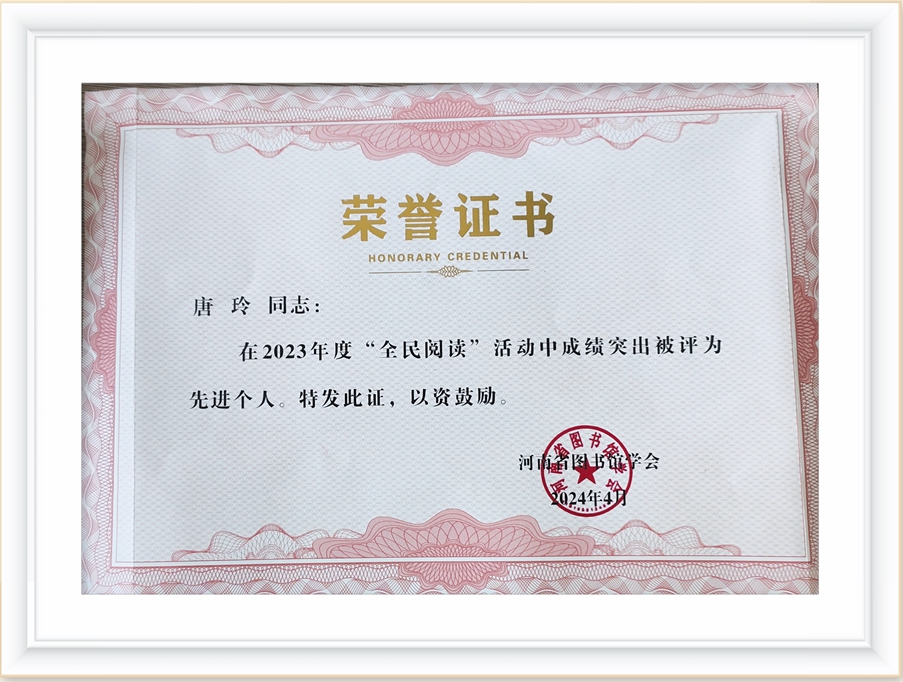2024年4月26日,河南省图书馆学会第十届三次全体理事会议在郑州嵩山饭店召开,本次大会对2023年全省各级各类图书馆“全民阅读”活动进行了总结和表彰,beat365图书馆被评为2023年度“全民阅读”先进单位,图书馆唐玲副馆长被评为2023年度“全民阅读”先进个人。