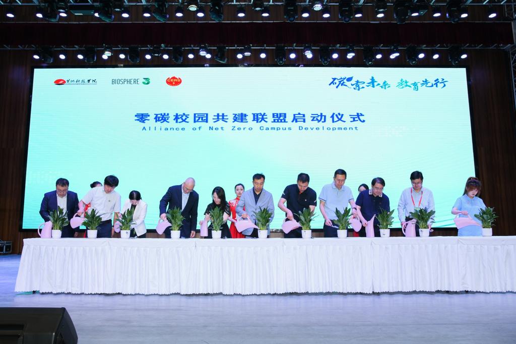 现场,杨保成与深石集团CEO张天先生签订《战略合作协议》,与万科公益基金会旗下的万沙控股有限公司董事长姜浩女士签订《共建零废弃校园战略合作协议》。双方将依托黄科大的研发团队和师资力量,发挥深石集团绿色低碳实践经验与行业资源优势,通过多种形式开展全面合作,共同构建绿色教育社区场景的产学研创新体系,共同打造国内一流、国际领先的高校场景零碳校园标杆。会上,零碳校园共建联盟首期单位的代表们上台为小树苗施肥,共同见证了零碳校园共建联盟的正式成立。