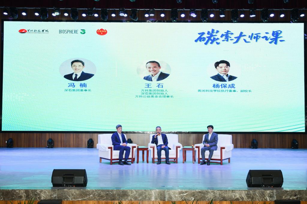 在探索大师课上,杨保成教授和王石先生分享了关于生活、零碳校园的认识。杨保成教授认为,黄科大进行零碳社区建设,不仅是物理空间的探索,更是在专业设置、人才培养、科学研究、社会服务上与低碳整体大发展战略的紧密结合,这样更能够体现出我们学校与其他组织的不同。他指出,做了一个大学,最重要的职能就是教育学生,其中教育学生具有强烈的绿色环保理念、并且作为绿色环保理念的传播者走向社会是一个非常重要的内容。他认为,大学实际上是对学生的一种投资,我们现在做的整个校园的改善,包括绿色低碳校园的建设也是一种投资,希望通过这些投资让学生终身成长、获得自己的声誉,从而有能力反哺学校,达到学生和学校的正向循环。关于学生提出的如何更好从事绿色低碳工作、在学习生活中如何更好的实践贡献绿色低碳等问题,他从国家产业布局和新质生产力方面给出了解答,并建议学生参与到学校绿色校园改造的项目化课程中,进行实践锻炼学习。