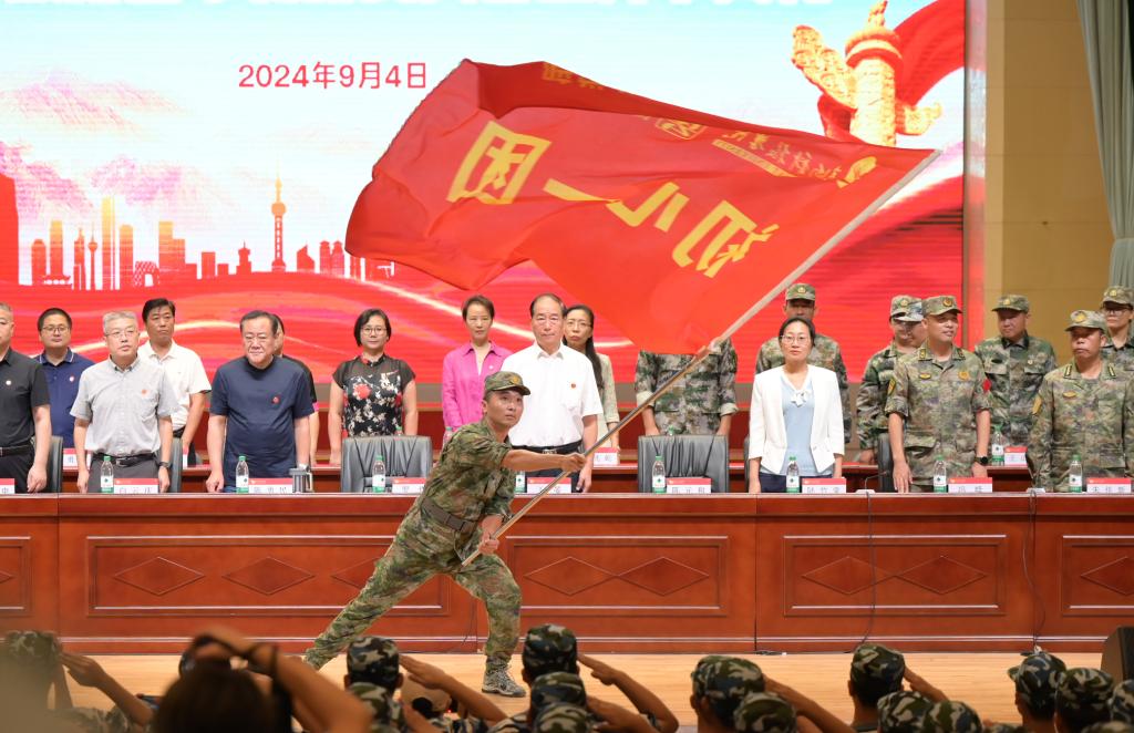 艺体学部党委副书记、第一军训团副政委朱传新宣布军训团建制。学校副校长、军训师师长罗煜为初心一团授团旗。全体参训学员向团旗敬礼,高喊“听党指挥,能打胜仗,初心一团,勇往直前!”