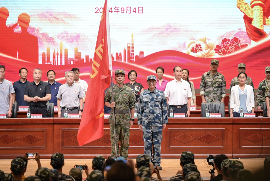 喻新安向商学部雷霆三团四个营授旗,1069余名本科新生雷霆般的誓言在现场回荡,同学们表示将听从指挥,严守纪律,勇于实践,全方位提高自身素质,使自己在德、智、体、美、劳等方面得到全面发展,努力成为社会主义事业的合格建设者和可靠接班人。