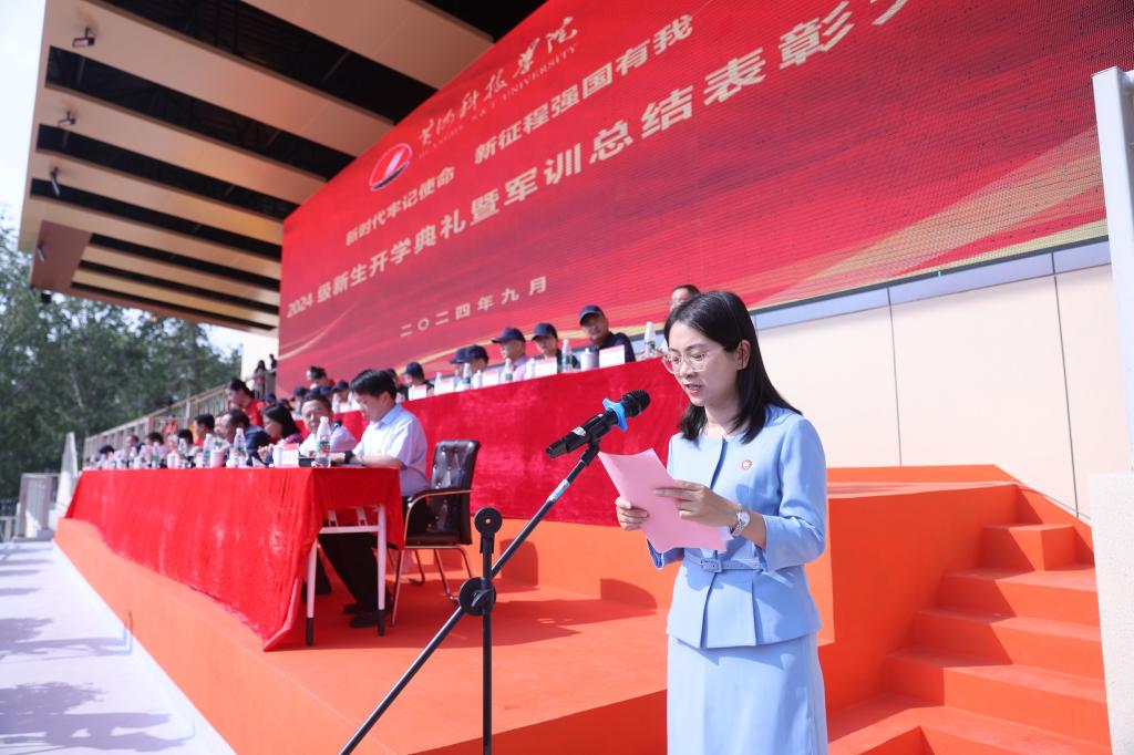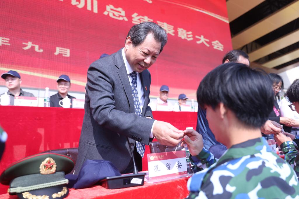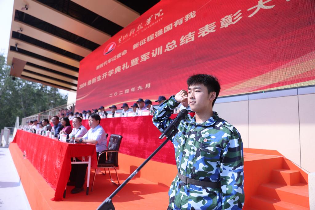 医学部老师付丽娜作为教师代表发言,商学部2024级工商管理专业学生许锦锐作为学生代表发言并带领全体新生宣誓。孔留安校长在讲话中肯定了参训同学在军训中的优异表现,为刚刚开启的大学生活交上了第一份优秀的答卷。大学时代已经开始,如何启航新征程,不负新时代,努力成为堪当伟大复兴重任的时代新人?孔留安送给新生们四句话:一是莫负新时代。要用理想信念之光,照亮前行的道路,攒足干事创业的本钱,莫负新时代。二是做出新谋划。要进行自我管理,严于律己,养成规律的作息习惯,树立良好的学术道德。要进行学业规划,专注于学习钻研,在重点和难点上下功夫并举一反三。要进行时间规划,统筹安排课内学习和课外活动的时间,协调好学习、锻炼和放松的时间。要进行情绪管理,主动学习心理健康知识,调整好自己的情绪,保持乐观豁达态度,成为阳光快乐的人。三是确立新追求。有追求的人生才更加充实,有追求的人生才更加快乐,所以,同学们切莫被“高考后遗症”所困惑,更应该确立新追求。四是要有新作为。作为新时代的佼佼者,理应坚定理想信念,勇敢地承担起时代赋予的重任。在人生这场马拉松赛中,既要在求学的跑道上争先创优,还要把自己的所学、所思、所想付诸实践,这也是学校“开拓、拼搏、实干、奉献”精神的应有之意。孔留安说,新时代是背景和基础,新谋划是方式和方法,新追求是目标和方向,新作为是行动和实践。他期待,同学们以强壮的体魄,健康的心理和坚韧的毅力投入到未来的学习、生活和工作之中,用实际行动让父母为你们骄傲,让师长为你们喝彩,让学校为你们自豪!在全体师生铿锵有力的《没有共产党就没有新中国》歌声中,2024级新生开学典礼暨军训总结表彰大会圆满闭幕。