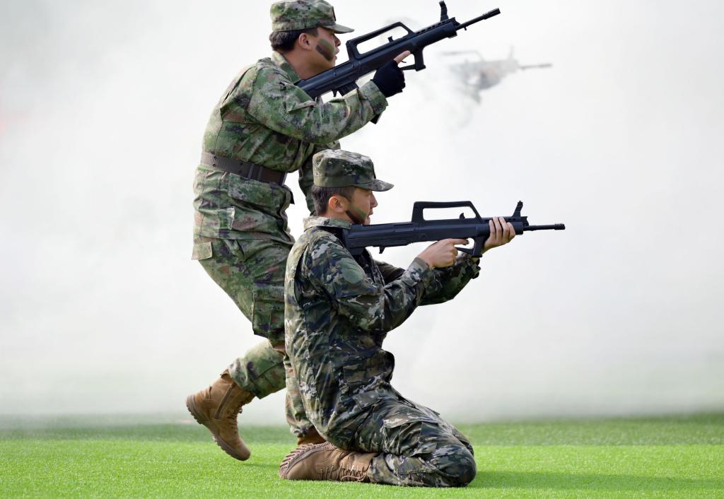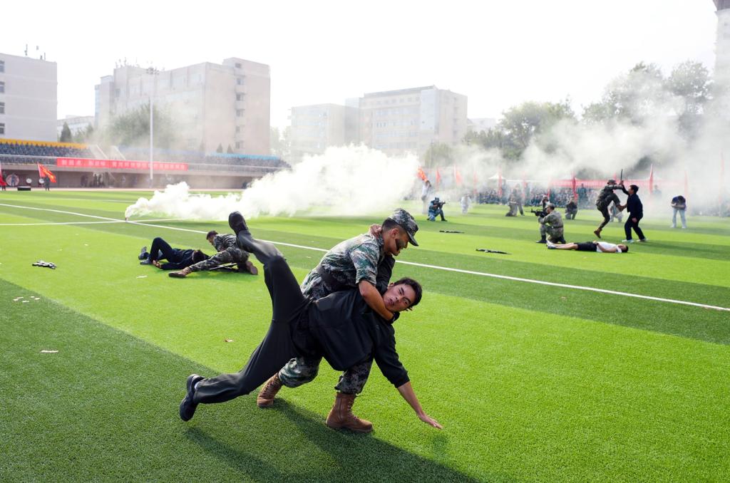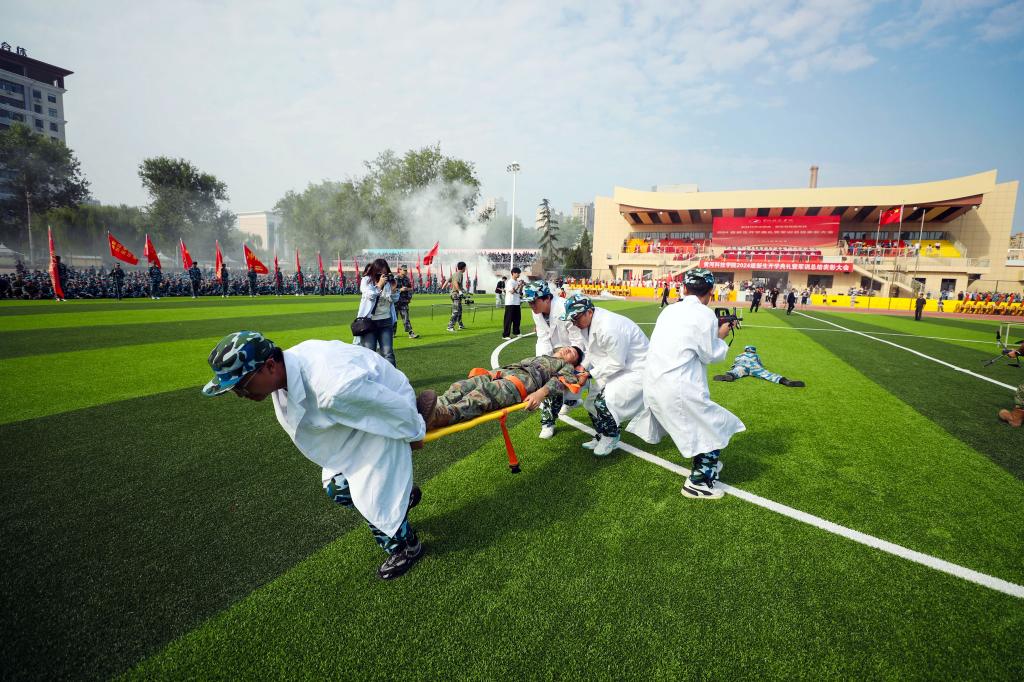 分列式结束后,映入大家眼帘的是更为精彩的特色方阵表演及文艺演出。由工学部、艺体学部、商学部、医学部、国际学院、职业技术学院290名军训学员带来的擒敌拳让大家感受到了英雄豪情和巾帼风采。由16名军训教官组成的战术方队表演,通过设定不同的场景以及战友间的队形变换、灵活应变和默契配合展示了战术的方法和魅力。模拟射击方队以专业的姿态、专注而坚定的眼神和稳定而标准的持枪姿势向大家进行了精彩展示。艺体学部师生带来的体育舞蹈《燃动青春 超越自我》、合唱《向往》、舞蹈与武术表演《敢为天下先》用饱满的热情、高昂的士气、精彩的表演点燃了全场。