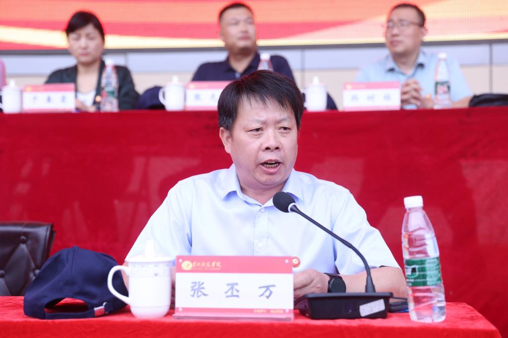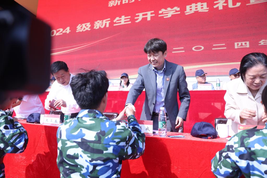 董事长胡大白,二七区人武部上校部长李长鑫,执行董事、副校长杨保成,校领导孔留安,董事会专家咨询委员会主任赵卫东等,以及校友代表1992级国贸专业校友贺勇、1998级建筑工程专业校友陈啟来,各教学单位的部长、院长、分党委书记,相关职能部门负责同志在主席台就座,2024级全体新生、教师代表参加。会议由学生中心主任张丕万主持。