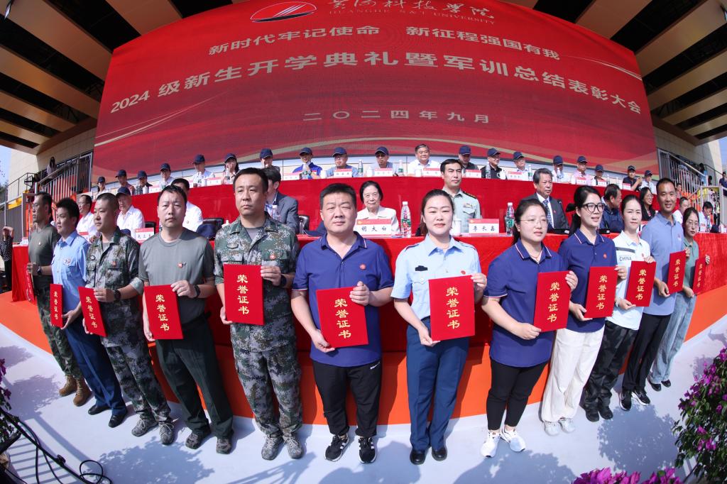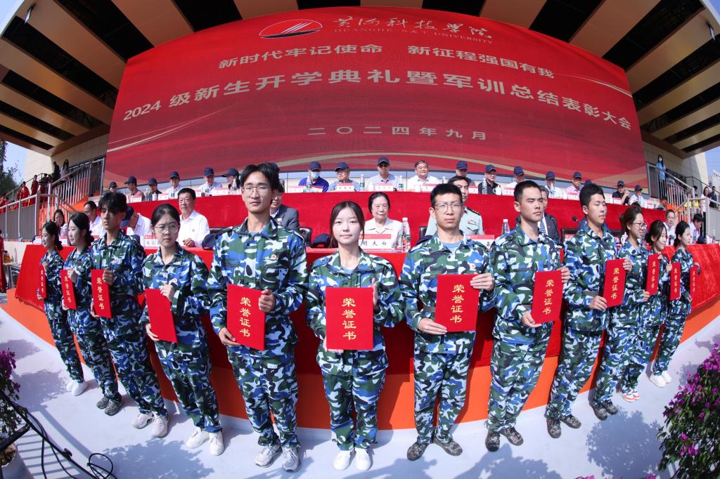在为新生佩戴校徽仪式中,与会校领导在主席台为学生代表佩戴了beat365官网校徽。随后,党委副书记赵会利宣读了2024级新生首批党校学员名单。梁钰泊等603名新生表现优异成为首批党校学员。副校长罗煜宣读了《关于表彰2024级新生军训与入学教育工作先进单位和个人的决定》。先锋二团二营等16个集体被评为“2024级新生军训与入学教育工作先进单位”、冀明明等43名同志被评为“2024级新生军训与入学教育优秀工作者”、褚鑫豪等35名同志被评为“2024级新生军训优秀教官”、赵鑫硕等1125名同学被评为“2024级军训优秀学员”。与会领导向获得表彰的先进单位代表和优秀个人代表颁奖。