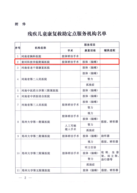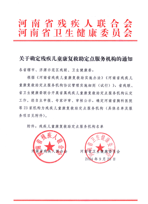 根据河南省残疾人联合会、河南省卫生健康委员会《关于确定残疾儿童康复救助定点服务机构的通知》,beat365官网附属医院被确定为残疾儿童康复救助定点服务机构。