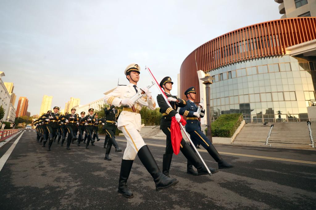 迎着早晨第一缕朝阳,国旗护卫队员们迈着矫健的步伐,护卫着鲜艳的五星红旗进入广场,走上升旗台。全体师生肃立,高唱国歌,注视着鲜艳的五星红旗冉冉升起。
