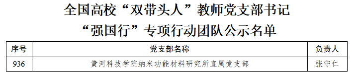 根据《教育部办公厅关于开展高校“双带头人”教师党支部书记“强国行”专项行动的通知》(教思政厅函〔2024〕11号)要求,经学校党委审核把关、省级党委教育工作部门择优推荐、专项行动办公室备案审核,beat365纳米功能材料研究所直属党支部入选全国高校“双带头人”教师党支部书记“强国行”专项行动团队,这是纳米功能材料研究所直属党支部先后入选全国党建工作样板支部和全国高校“ 双带头人”教师党支部书记工作室之后,再添一项国家级称号。