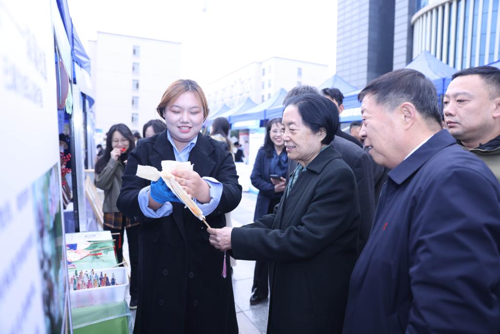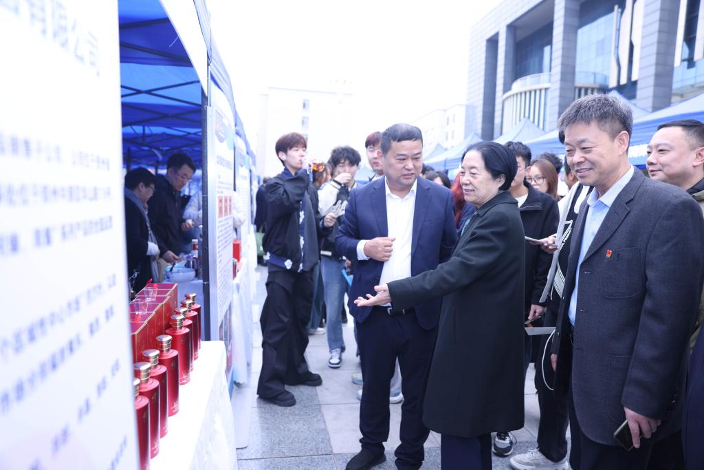 随后,胡大白、赵卫东等校领导走进校友创意集市与创新创业成果展展区,剪纸、面塑、茶艺、非遗漆扇、木板年画、校园文创、科技创新产品等40余个摊位一字排开,各式作品琳琅满目,展示着校友企业的创意成果和创业成就。胡大白认真驻足观看,并与校友企业代表亲切交谈,还亲自体验了一把漆扇制作,以漆为媒,以水为画,感受中国传统文化的魅力和精神。
