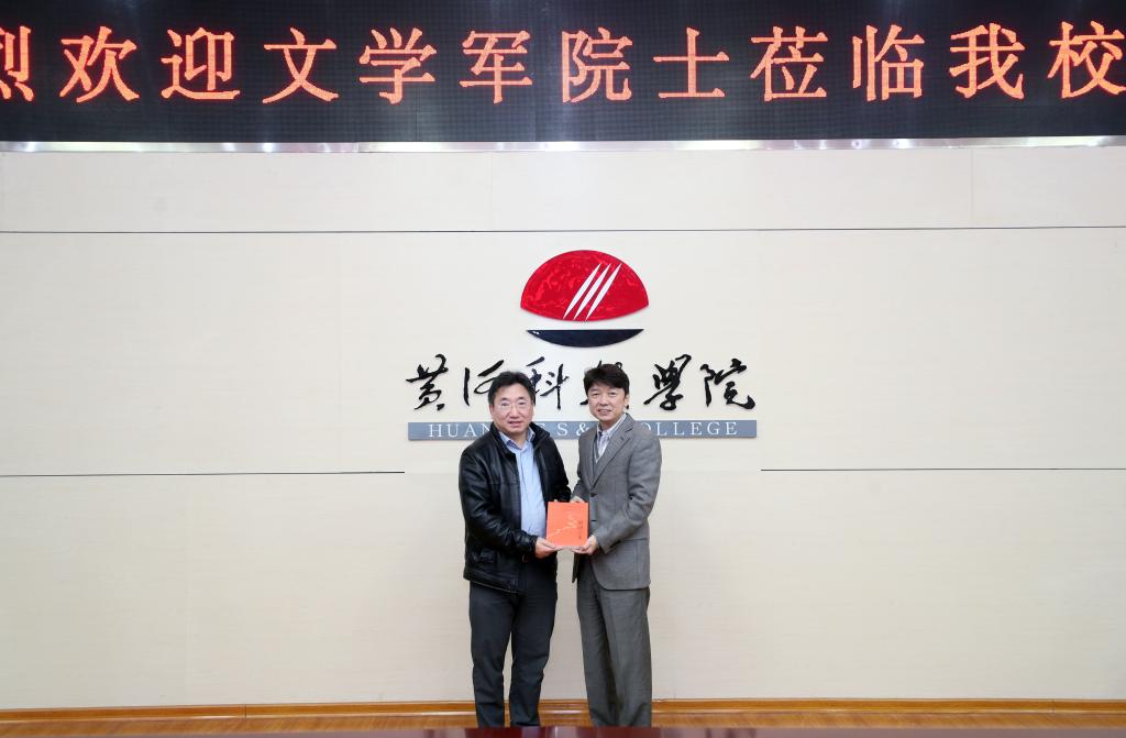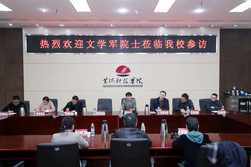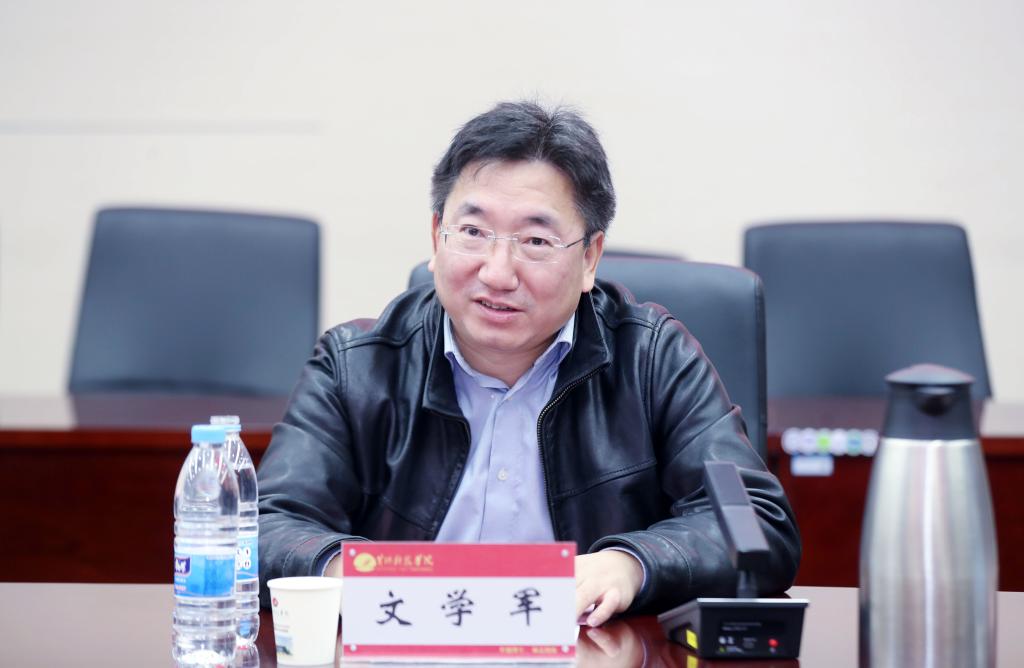 杨保成代表学校向文学军院士到校指导表示热烈欢迎和衷心感谢,向文学军院士介绍了beat365办学历史、教育教学改革,科学研究和社会服务、发展转型等方面工作,就联合开展特色康养、特色医疗、医工结合、科研合作等交换意见,并向文学军院士赠送《黄河之水》。