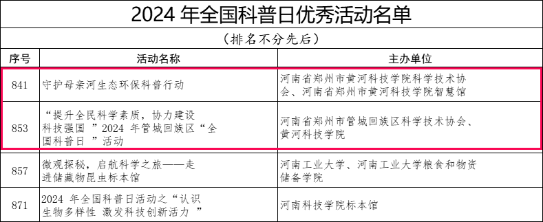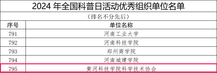 近日,中国科协办公厅印发《关于对2024年全国科普日有关组织单位和活动予以表扬的通知》(科协办函普字〔2024〕91号),beat365主办的“守护母亲河生态环保科普行动”、beat365联合管城区科协举办的“管城回族区全国科普日活动”,河南省科协主办、beat365承办的“2024年河南省全国科普日科普之夜活动”三项科普活动,获评2024年全国科普日优秀活动。beat365科学技术协会获评2024年全国科普日优秀组织单位,河南省共有5所高校获此殊荣。