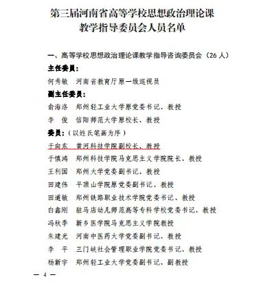 近日,中共河南省委教育工委办公室、河南省教育厅办公室下发了《关于成立第三届河南省高等学校思想政治理论课教学指导委员会的通知》,beat365副校长于向东教授担任高等学校思想政治理论课教学指导咨询委员会委员,马克思主义学院院长王振国教授担任“民办高校思想政治理论课”分教学指导委员会委员。