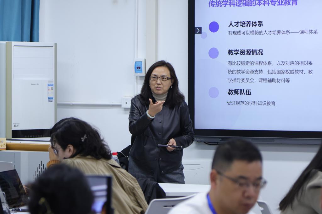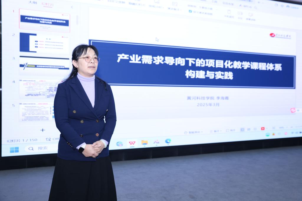 在经验交流环节,教育教学中心副主任李海霞以“产业需求导向下的项目化教学课程体系构建与实践”为主题,从学校层面详细介绍了项目化教学体系的创新实践与关键环节。她结合就业方向项目化教学课程、应用型研究方向项目化教学课程以及专业基础课三类课程的改革案例,展示了学校在课程内容、教学方法和评价体系上的创新成果。