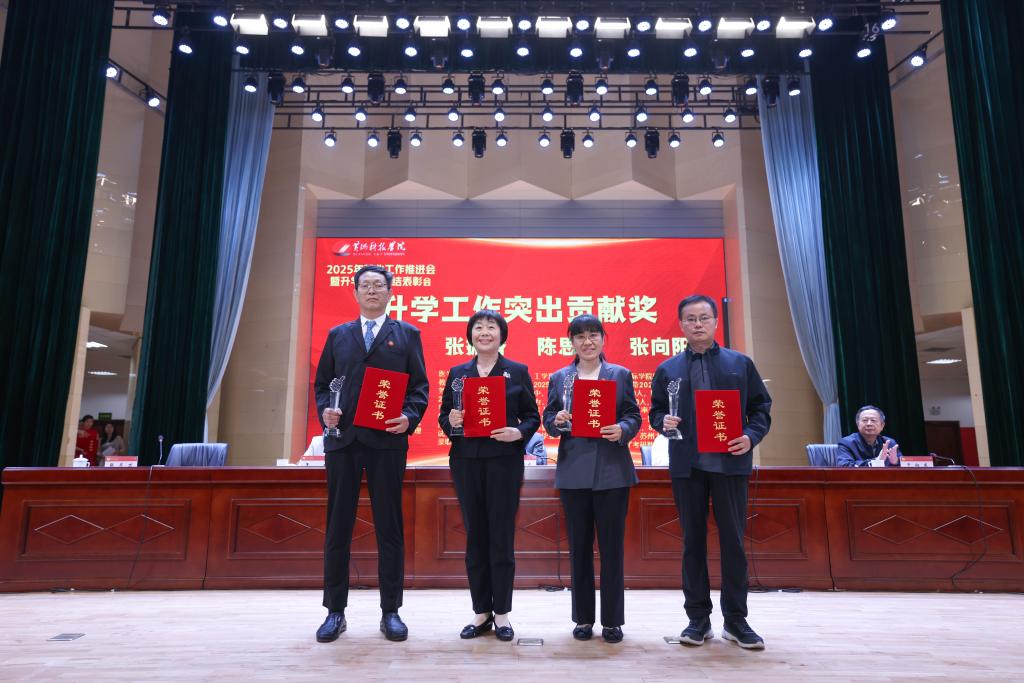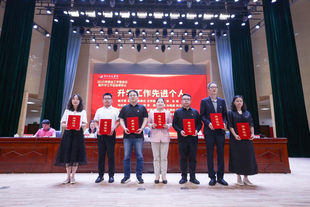 孔留安宣读《beat365官网关于表彰2025年升学工作先进集体和个人的决定》,医学部、工学部、国际学院3个教学单位荣获“升学工作先进集体”,工学部教授陈思杰、医学部学业导师张振香、商学部教师王雪芹、国际学院辅导员张向阳4名教师荣获“升学工作突出贡献奖”,表彰会授予杨颖等45名教师 “升学工作先进个人”。