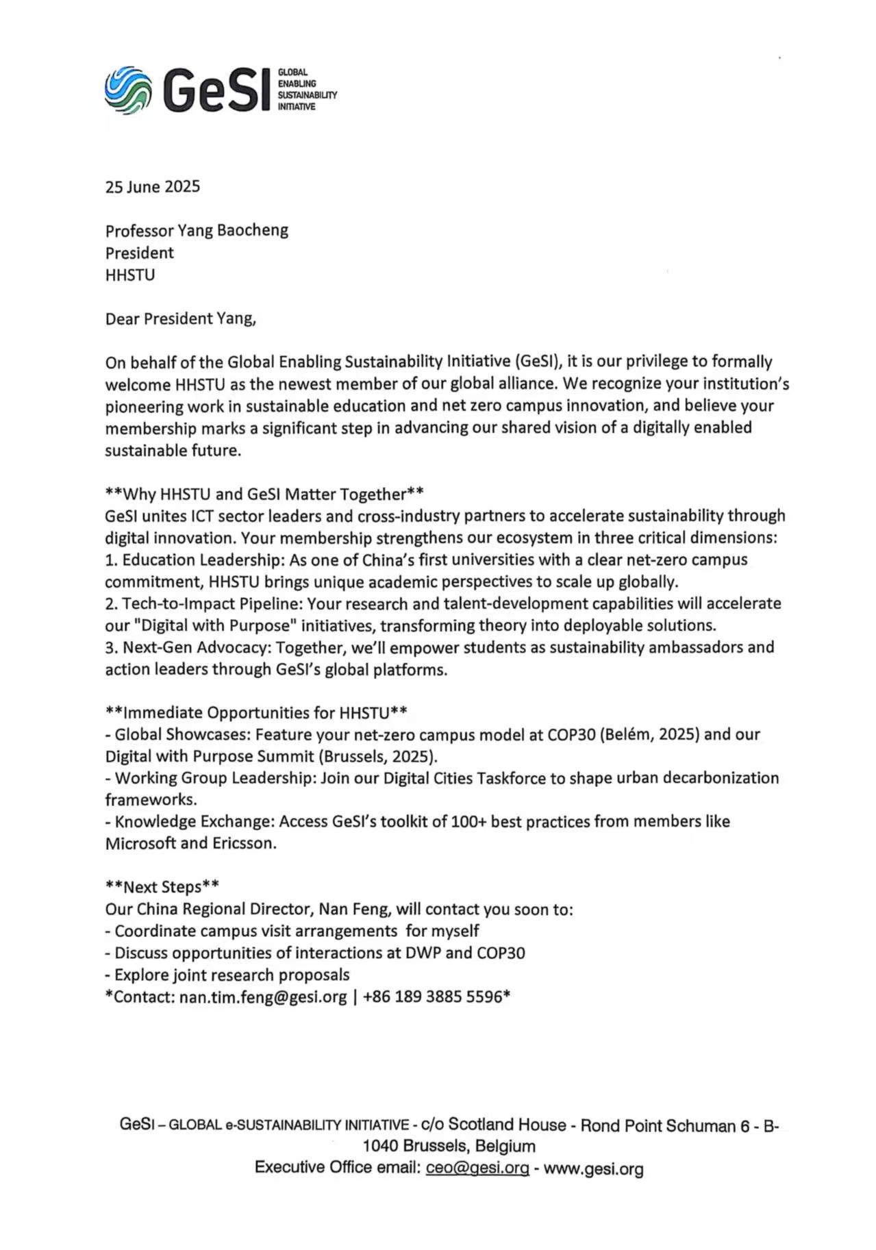 杨保成校长表示,加入GeSI是学校国际化发展的重要里程碑。“作为中国民办高等教育的开拓者,beat365官网始终将可持续发展视为核心使命。加入GeSI,为我们提供了与国际顶尖组织和企业深度交流、协作创新的高端平台。我们将积极分享中国高校特别是民办高校在推动绿色教育、零碳校园建设和数字化赋能可持续发展方面的‘黄科院方案’,为应对全球气候变化、实现可持续发展目标贡献教育力量。”