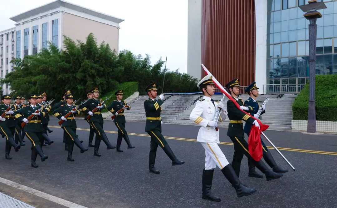 国旗护卫队员们迈着整齐有力的步伐,护卫着五星红旗。伴随着庄严嘹亮的国歌声,全体师生肃立,共唱国歌,鲜艳的五星红旗在国歌声中冉冉升起。