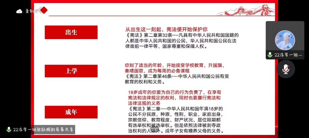 召开主题班会。11月28日至12月4日,辅导员组织召开学宪法主题班会。辅导员组织学生或诵读宪法有关章节、条款,或讲述身边的法制故事,或观看相关法制宣传视频,让学生对宪法有了进一步的认识。班会的召开增进了同学们对宪法的认识,丰富了青年学生的法治文化生活,传递了依宪治国,依宪执政的理念,更加深化了宪法在青年学生心中的权威性。