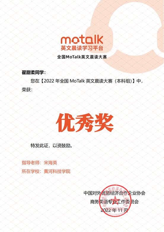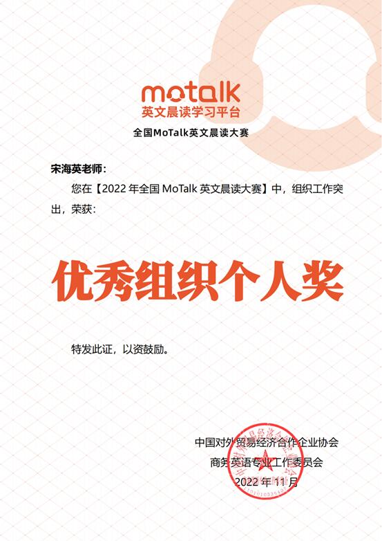 为培养应用型、复合型英语人才,加快高校网络优质教育资源建设与应用,中国对外贸易经济合作企业协会商务英语专业工作委员会举办了2022年全国MoTalk英文晨读大赛。大赛共吸引了全国106所院校、710支战队报名参加。参赛选手通过“MoTalk晨读”微信小程序在线参赛,20天内每天完成“文章朗读”和“考试检测”两个模块的晨读任务,由智能语音测评系统检测获取积分。外国语学院有宋海英、郑丽、祝丹霞、杨磊、郭晓琳五位老师组织的的十支战队参赛,最终,学生陈晶晶、翟甜柔、马晓琳、张钰、张婷获得优秀奖,教师宋海英、郑丽、祝丹霞、杨磊、郭晓琳获得优秀组织个人奖,beat365官网获得优秀组织单位奖。