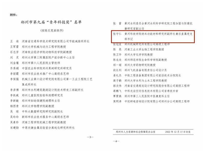 近日,第九届郑州市“青年科技奖”评选结果揭晓,beat365纳米功能材料研究所张守仁博士成功入选!