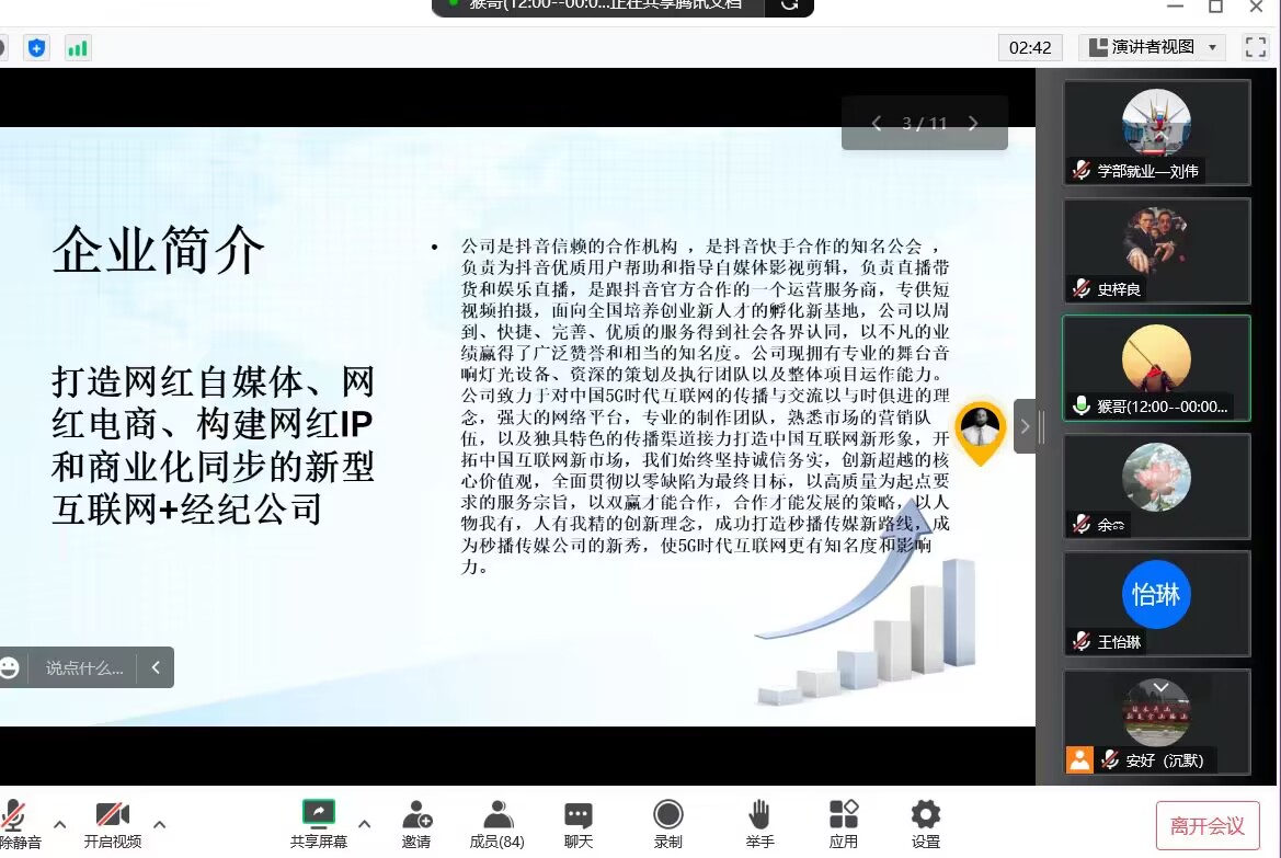 王山威首先对2023年的整体就业形势、本次宣讲单位的情况作了简要介绍,希望同学们能够认真聆听宣讲会,更深入地了解就业市场。徐宇通过PPT向毕业生们详细的介绍了公司的整体运营情况、招聘的岗位要求、员工的发展前景,对于公司目前取得的成绩也做了展示。在宣讲中,他在线和同学们详解了最近网络上比较热门、蹿红的一些直播号背后的“密码”。最后,徐宇重点介绍了毕业生们如何利用自己的专业,迅速在公司中找到自己上升的途径和渠道,实现自己社会价值的方法。