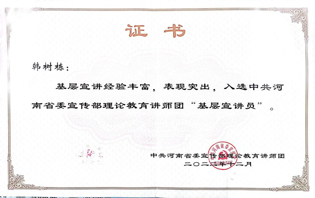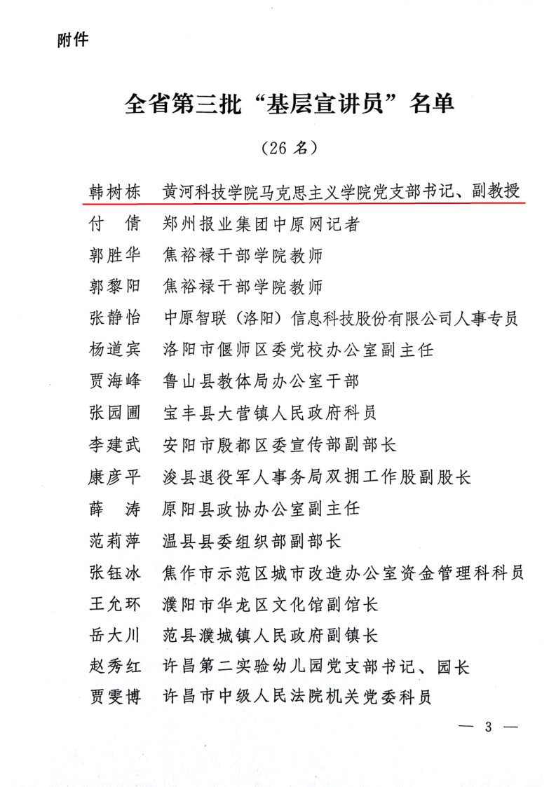 近日,河南省委宣传部公布了全省26名第三批“基层宣讲员”名单及全省35名第三批“新时代百姓宣讲员”名单。学校马克思主义学院党支部书记韩树栋入选全省第三批“基层宣讲员”。