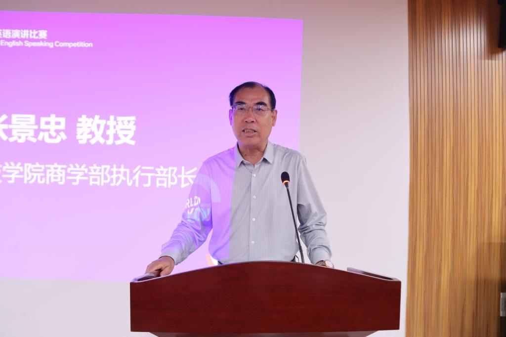 商学部执行部长张景忠教授全英文致辞,他指出了此次演讲比赛的重要作用。通过比赛,同学们不仅能够提高自己的英语口语水平和交际能力,更能展现自己的独特才能。他希望大家能够站在更高的舞台上,用英文讲好中国故事,让世界倾听我们的声音。