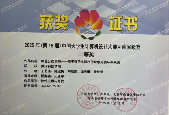 近日,2025(第18届)中国大学生计算机设计大赛河南省级赛在河南牧业经济学院(英才校区)和郑州工程技术学院(金河校区)举行。工学部闫均豪团队的《智盔先锋——尖端科技打造智能安全头盔》斩获一等奖,王艺瑾团队的《绿色分类星球——基于微信小程序的垃圾分类环保系统》荣获二等奖,另有6个团队作品获三等奖。