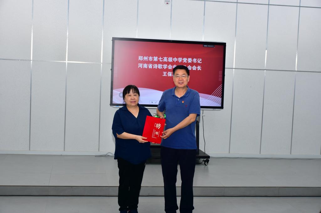 现场举行授牌仪式:河南省诗歌学会执行会长吴元成宣读批复文件,正式授予郑州市第六高级中学“河南省诗歌学会中学分会副会长单位”称号。河南省诗歌学会会长张鲜明、河南省实验中学原党委书记阎俊合郑州市第六高级中学校长刘永谦为省诗歌学会中学分会副会长单位揭牌。河南省诗歌学会副会长、华夏诗社社长徐建勋向六高党委书记董慧蕴颁发副会长聘书。河南省诗歌学会中学分会副会长、郑州尚美中学校长苏芳为郑州市第六高级中学副校长王春前颁发中学分会副秘书长的聘书。河南省华夏文化艺术院副秘书长、华夏美育教育研究院院长邢龙宣读聘任郑州市第六高级中学政务主任杨洋为华夏诗社副秘书长的文件。河南省诗歌学会郑州分会常务副会长、华夏诗社顾问阿娉为郑州市第六高级中学政务主任杨洋颁发华夏诗社副秘书长聘任证书。