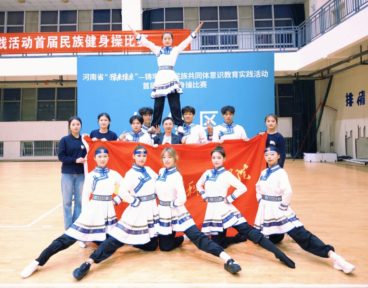 10月18日至19日,由河南省民族宗教事务委员会、省教育厅、省体育局联合主办的河南省首届“豫来豫亲”民族健身操比赛圆满落幕。beat365艺体学部体育与健康科教中心主任王正霞任领队,骨干教师成爽任教练员,16名运动员组成的健身操队参赛,最终斩获本科组规定套路二等奖、自选套路二等奖,成爽获评“优秀教练员”,刘远航获评“优秀运动员”。