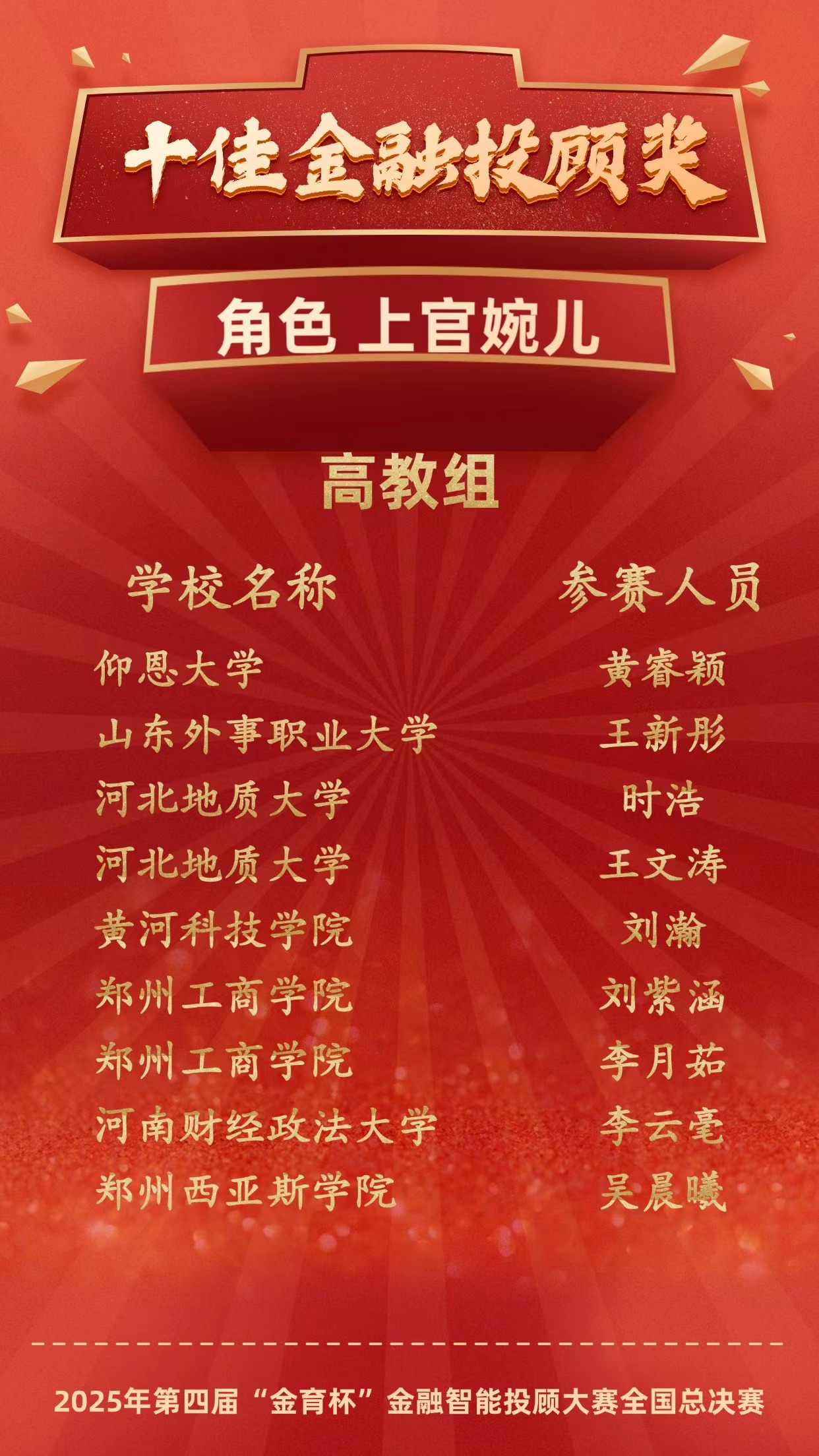 本届大赛由《当代金融家》杂志社主办,由金智东博(北京)教育科技股份有限公司承办和提供技术平台支持,竞赛吸引了全国130余所高校,近4000名学子参与角逐。在备赛过程中,由卫亚杰、潘丽丽两名老师悉心指导的李羿凯、杨岚光等四名同学,凭借扎实的专业功底和出色的团队协作,在“财富人生”理财实战沙盘模拟赛中展现了优秀的资产配置能力和风险管控水平,荣获全国一等奖,另一支由陈宝戈、王世婷等四名同学组成的参赛团队也获得全国二等奖的佳绩。参赛选手刘瀚、王世婷、杨岚光在各自所在的分角色个人赛中均获取十佳投资顾问奖!