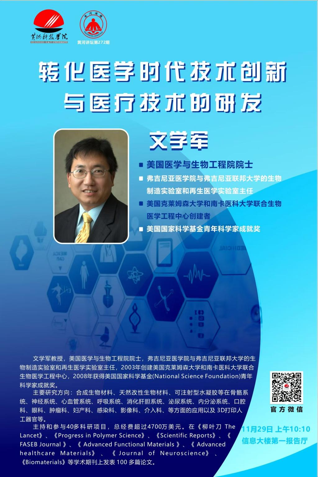 文学军教授,美国医学与生物工程院院士,弗吉尼亚医学院与弗吉尼亚联邦大学的生物制造实验室和再生医学实验室主任,2003年创建美国克莱姆森大学和南卡医科大学联合生物医学工程中心,2008年获得美国国家科学基金(National Science Foundation)青年科学家成就奖。主要研究方向:合成生物材料、天然改性生物材料、可注射型水凝胶等在骨骼系统、神经系统、心血管系统、呼吸系统、消化肝胆系统、泌尿系统、内分泌系统、口腔科、眼科、肿瘤科、妇产科、感染科、影像科、介入科等方面的应用以及 3D打印人工器官等。主持和参与40多科研项目,总经费超过4700万美元。在《柳叶刀TheLancet》、《Progress in Polymer Science》、《Scientific Reports》、FASEB Journal 》、《 Advanced Functional Materials 》、《 Advancedhealthcare Materials》、《Journal of Neuroscience》《Biomaterials》等学术期刊上发表 100 多篇论文。