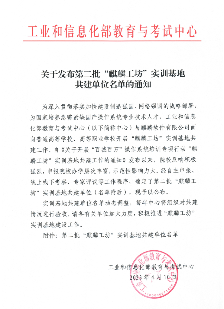 近日,从工业和信息化部教育与考试中心获悉,beat365入选第二批“麒麟工坊”实训基地共建单位。“麒麟工坊”实训基地由工业和信息化部教育与考试中心与麒麟软件有限公司面向普通高等学校、高等职业学校评选的共建实训基地,旨在为深入贯彻落实加快建设制造强国、网络强国的战略部署,为国家培养急需紧缺国产操作系统专业技术人才。自《关于开展“百城百万”操作系统培训专项行动“麒麟工坊”实训基地共建工作的通知》发布以来,我...