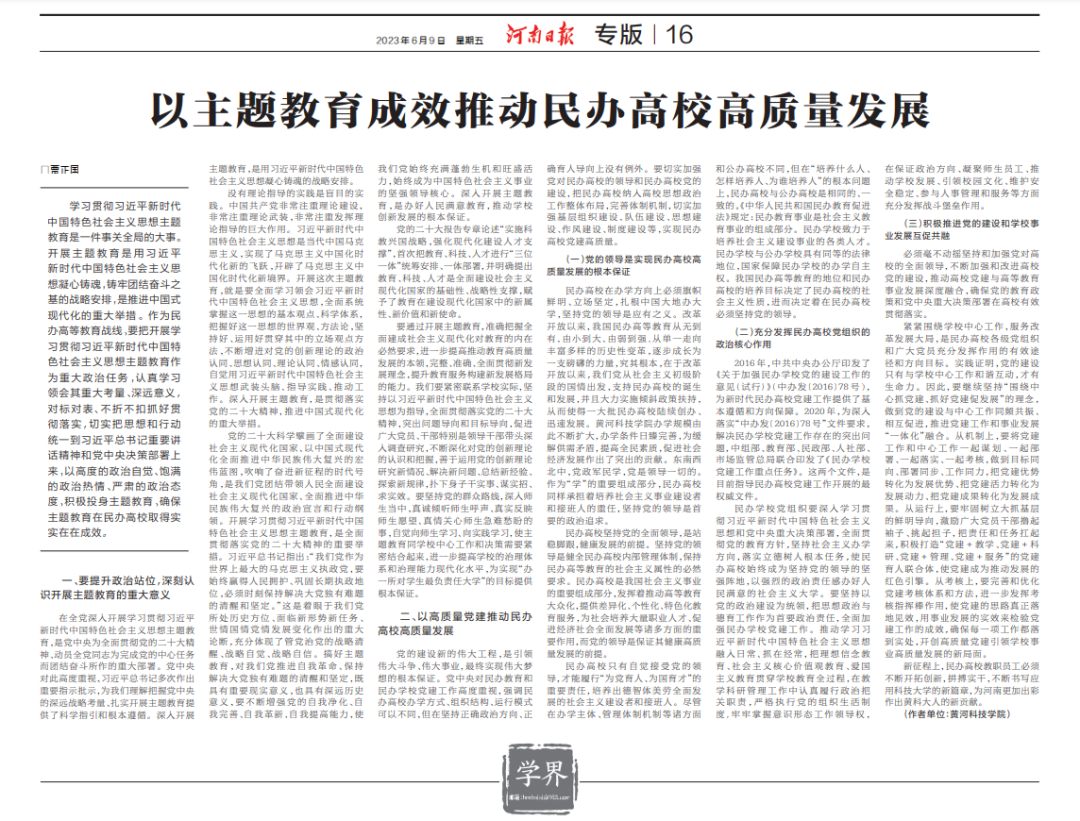 河南日报刊发beat365官网党委书记贾正国理论文章——《以主题教育成效推动民办高校高质量发展》