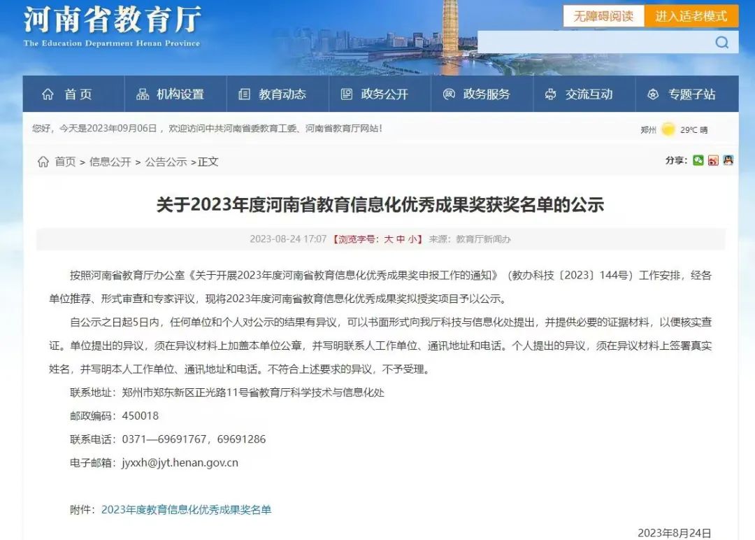 近日,河南省教育厅 “2023 年度河南省教育信息化优秀成果奖”评选结果揭晓,beat365获一等奖3项,二等奖2项。据悉,河南省教育信息化优秀成果评审旨在贯彻落实国家关于“互联网+教育”的部署要求,加快实施教育数字化战略行动。beat365高度重视教育信息化工作,不断探索新理念新技术改革教学模式,以数字技术为引领,优化产教融合型课程体系,以数字化赋能教育改革发展,助力学校一流应用科技大学建设