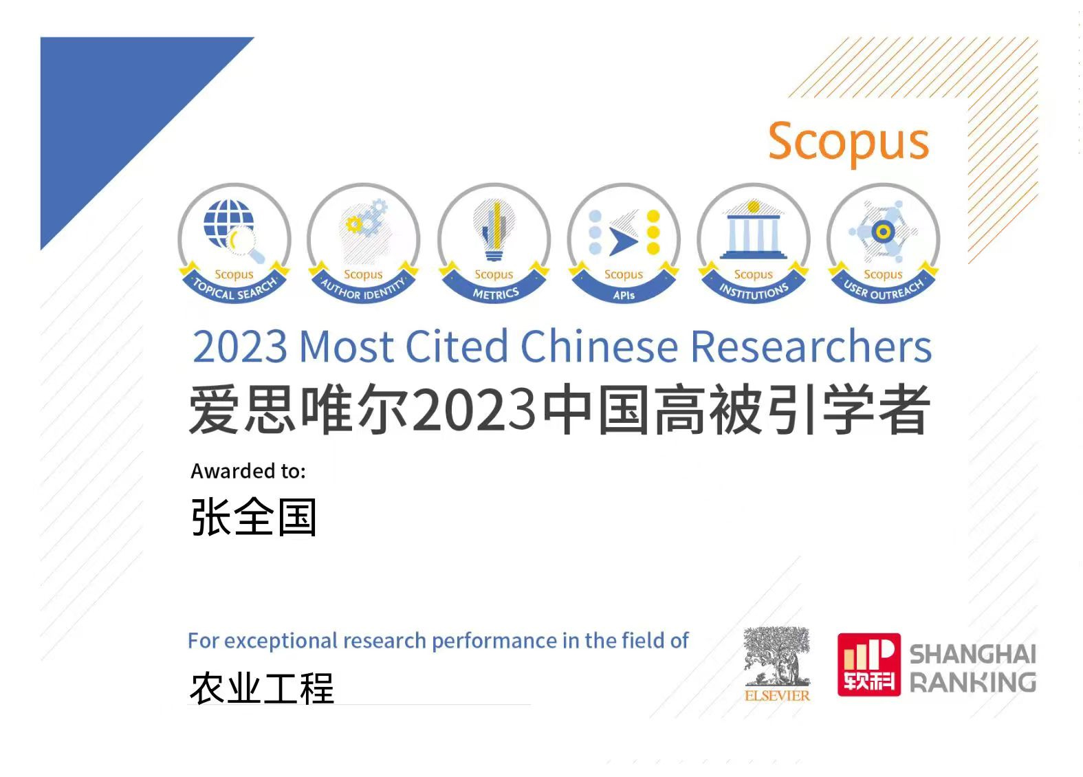 热烈祝贺现代农业工程研究院院长张全国教授入选Elsevier 2023中国高被引学者榜单